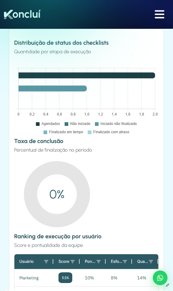 A Koncluí cobra a equipe de forma automática e valoriza quem faz certo com ranking gamificado. Clima mais leve e menos estresse